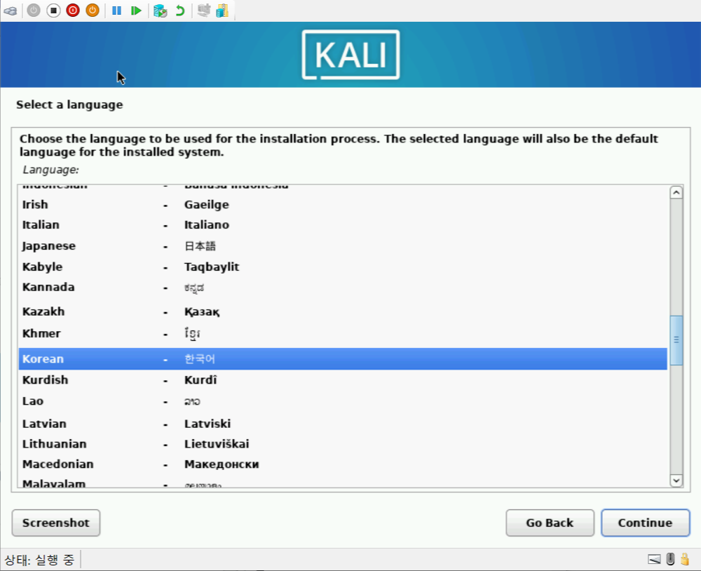 24. 설치 완료 후, 부팅 화면에서 Kali GNU/Linux 를 선택한다.