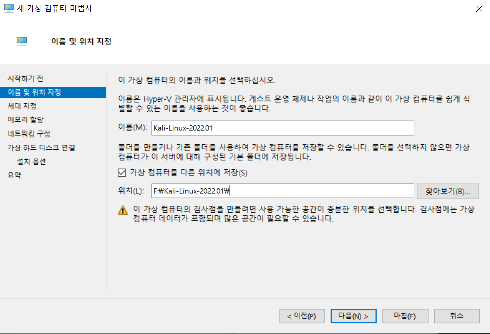 3. 이름 및 위치 지정 탭에서, 가상 머신에 대한 이름을 설정하여 주고 가상 머신 파일의 저장 위치를 별도로 설정하고 싶은 경우 적당한 위치를 지정한다.