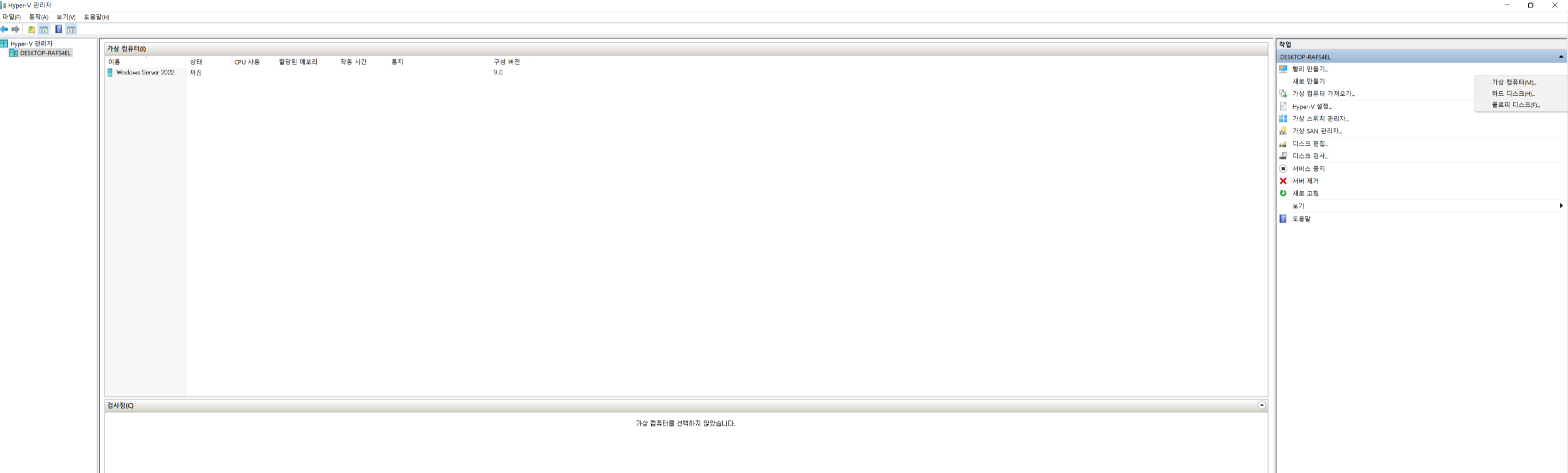 1. 먼저, 위와 같이 Hyper-V 관리자를 실행한다. 오른편 작업 메뉴에 '새로만들기 > 가상컴퓨터' 를 선택한다.