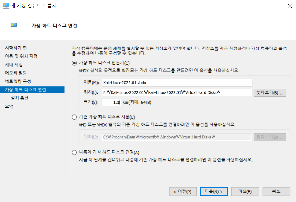 4. 세대 지정 탭에서는 1세대를 선택하고 다음을 클릭한다. 1세대와 2세대의 차이를 확인하여 보니, 2세대가 좀 더 최신 기술에 대한 지원 (UEFI 펌웨어, 더 큰 부트볼륨(2TB~64TB) 등)이 가능하다고 하는데 실제로 칼리 리눅스 설치를 위해 2세대를 선택하고 실행하여 보면, 부팅이 되지 않았다. 여기서는 1세대를 선택해주고, 다음을 선택한다.