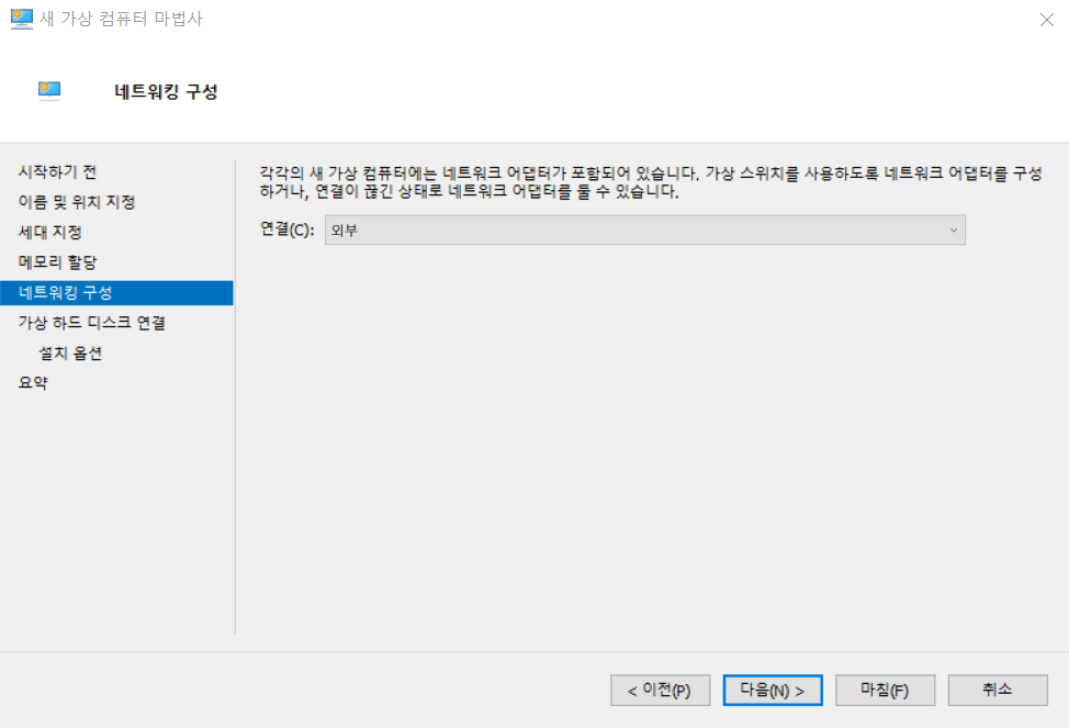 6. 네트워킹 구성에 대해서는 본인의 가상 컴퓨터 환경에 알맞게 설정하여 준다.