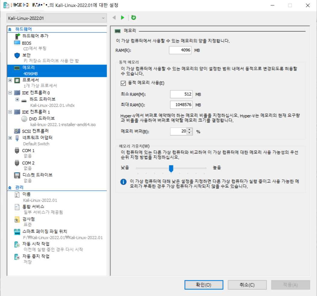 11. '하드웨어 > 메모리' 탭에서 '동적 메모리 사용' 항목에 체크한다.
