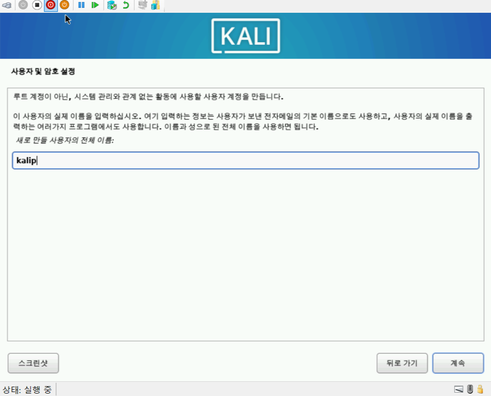다음 화면에서 계정 사용자의 이름을 입력해준다. 일단 해당 글에서는 사용자 계정과 동일하게 설정하여 설치 진행하나 꼭 동일하게 설정하여 줄 필요는 없다.