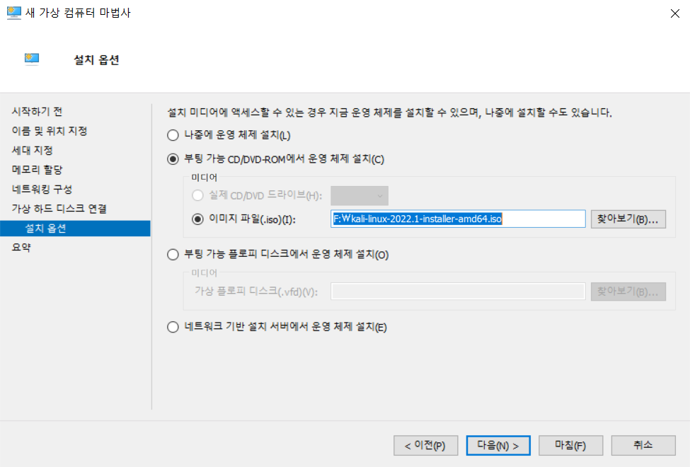 8. '부팅 가능 CD/DVD-ROM에서 운영 체제 설치' 항목을 선택하고, 미리 받아놓은 ISO 이미지 파일을 찾아 선택 후 다음을 클릭한다.