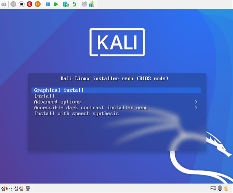 12. 설정을 마치면, 칼리 리눅스 이미지를 더블클릭하여 칼리 리눅스를 실행한다. 처음 부팅시 칼리 리눅스 설치화면이 나오는데, 여기서 Graphical install을 선택한다.