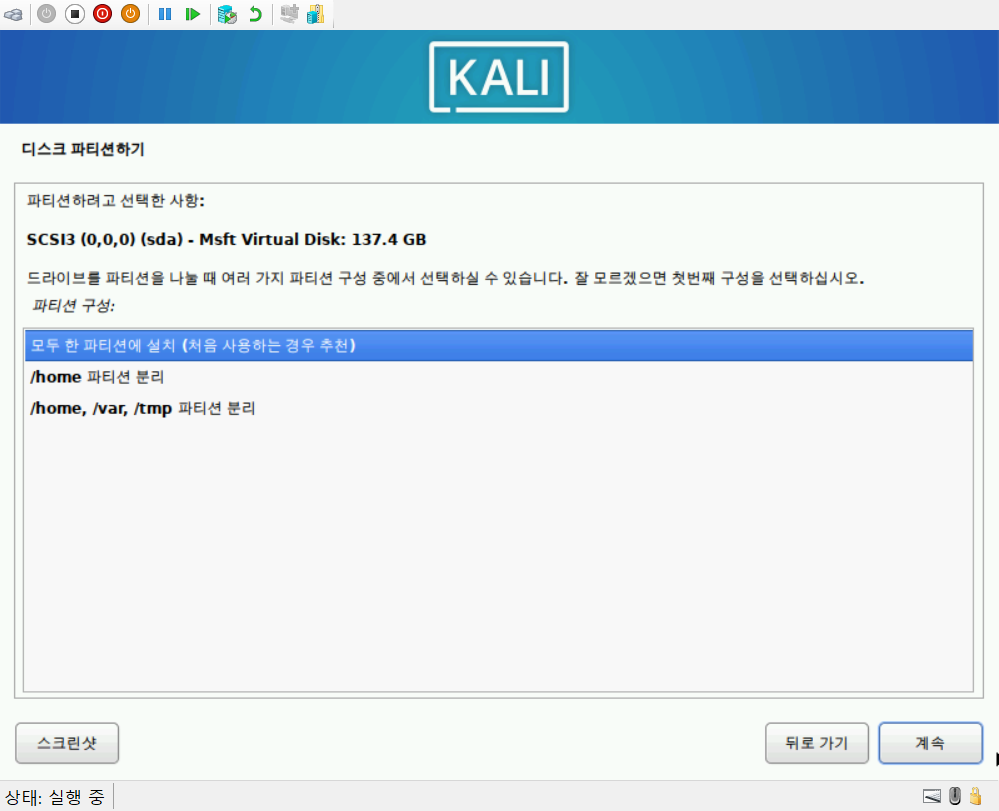 19. 디스크 파티션 구성표에서는 모두 한 파티션에 설치를 선택한다. 우선 추천 옵션인 '모두 한 파티션에 설치'를 선택하고 다음으로 넘어간다.