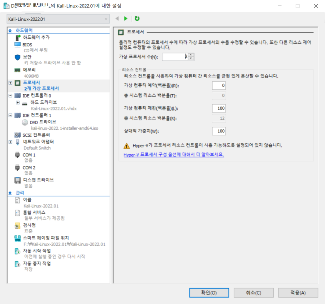현재 작성시점 기준으로 2023.1 버전 ISO 이미지로 hyper-v에 칼리 리눅스 설치 시, 시스템 부팅 시 검은 배경화면에 하얀 커서만 깜빡거리는 이슈가 있다. 구글링 해보니 해당 이슈에 대한 여러가지 해결책이 나와있는데, 수회에 걸쳐 여러가지 방법으로 재설치하여 보았으나, 제대로 구동이 되지 않았다. 혹시나 하여 2022.1 버전으로 설치하여 보니 한번에 설치 후 정상 부팅이 된다. Hyper-V에 최신형 칼리 리눅스의 설치를 권장하지 않는다.