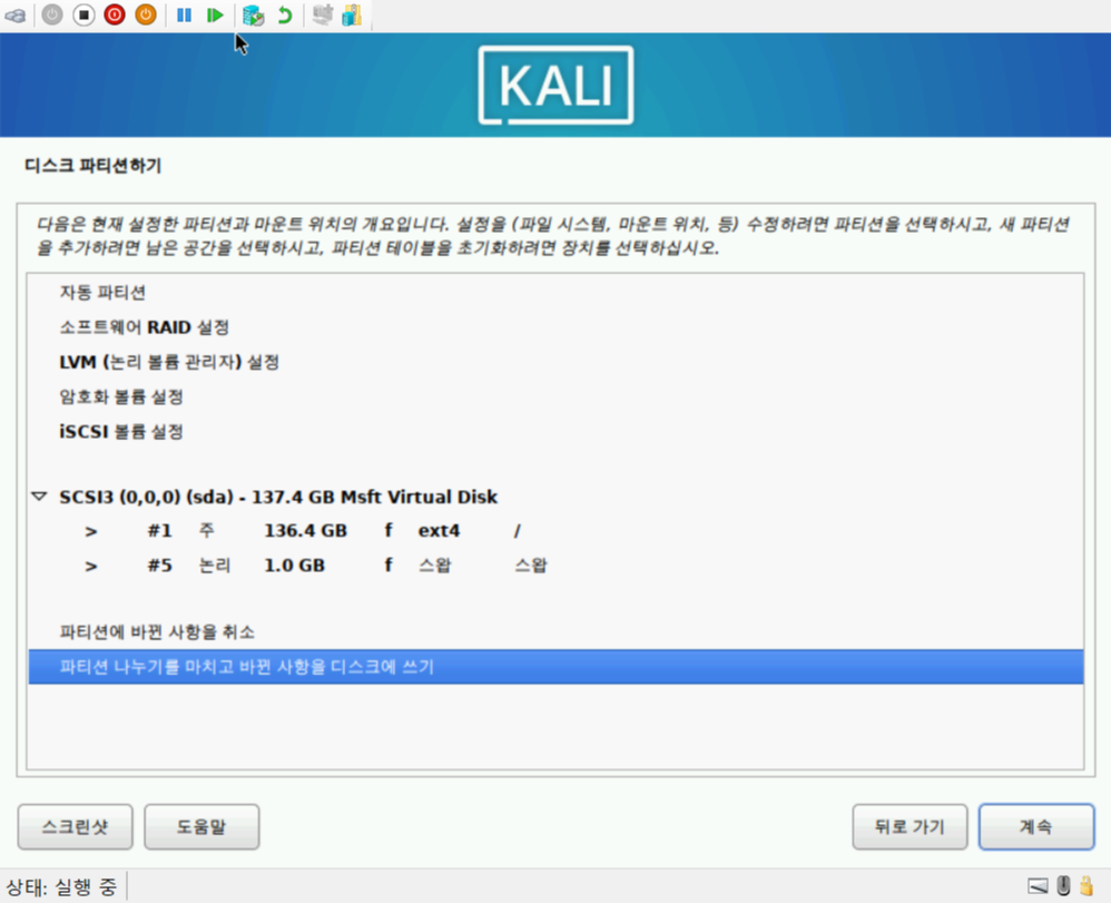 디스크 파티션 관련 선택 옵션을 확인하고, 계속 진행한다.